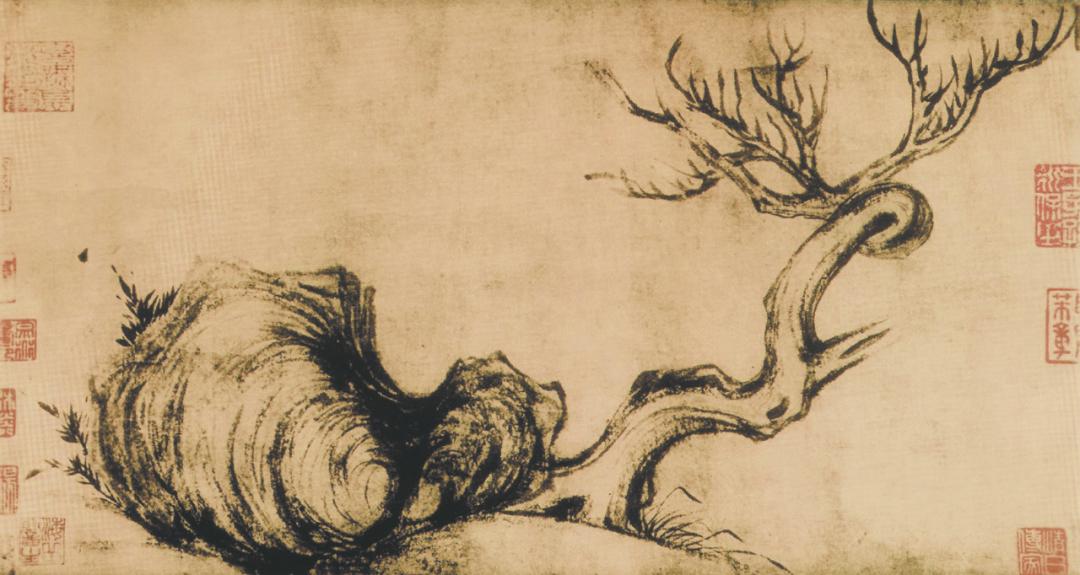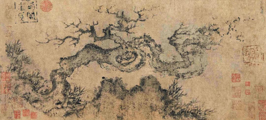 《枯木怪石图》,宋,苏轼,纸本,全卷连裱共长 543 厘米。苏轼任徐州知州时亲往萧县圣泉寺时所创作。此图原藏于日本,2018 年在香港佳士得以 4.6 亿港币成交,现存中国