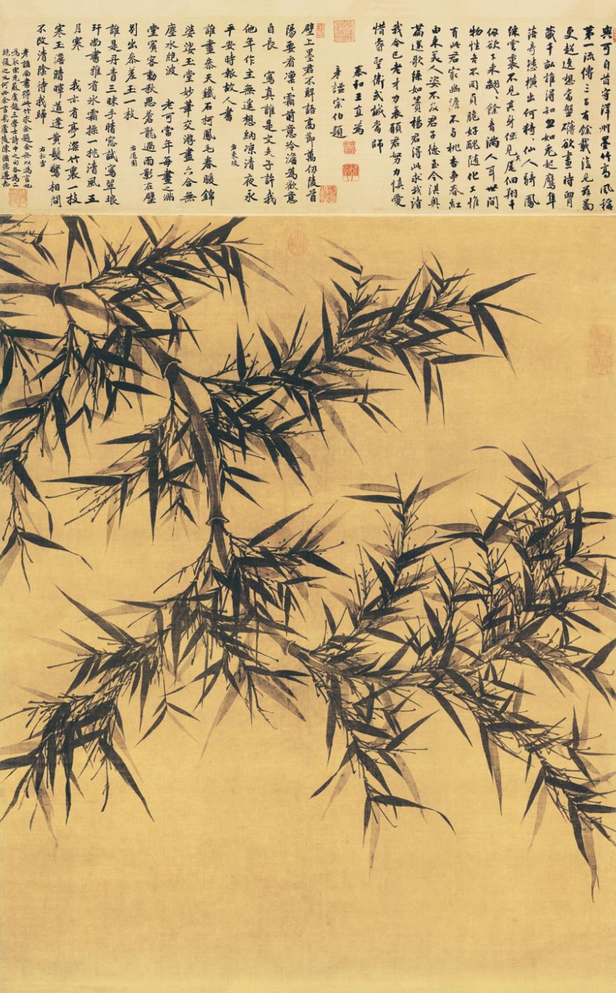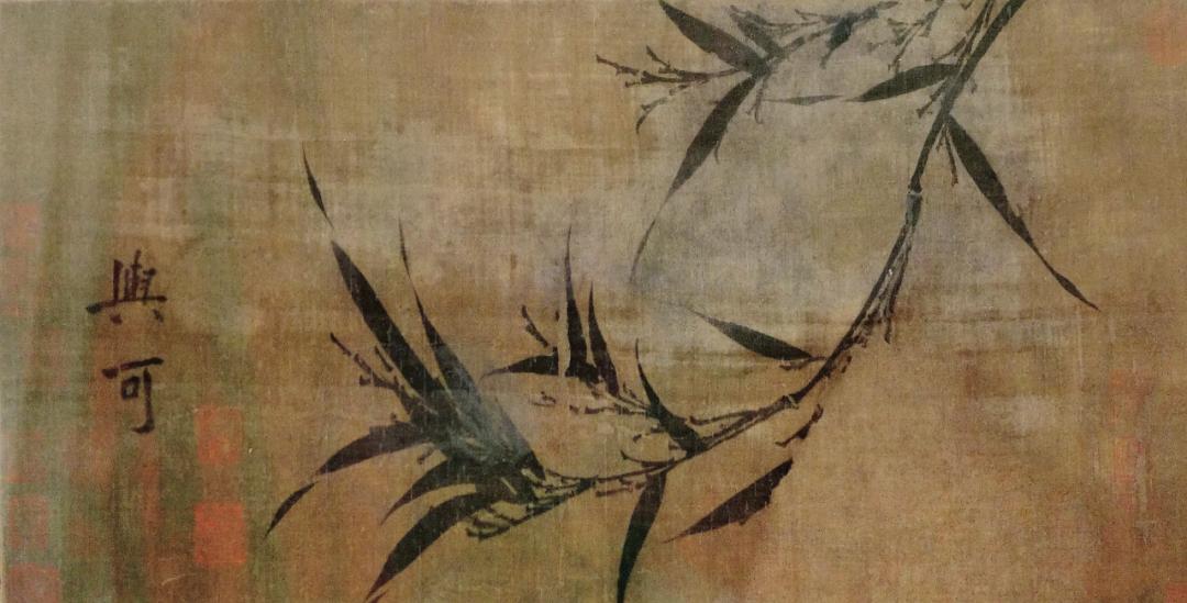 《墨竹图》,宋,文同,绢本水墨,现藏台北故宫博物院。文同画竹首创以墨深为面,以墨淡为背的竹叶画法,正反浓淡错落有致,其墨竹风格对后世影响极深,成为湖州竹派开创者