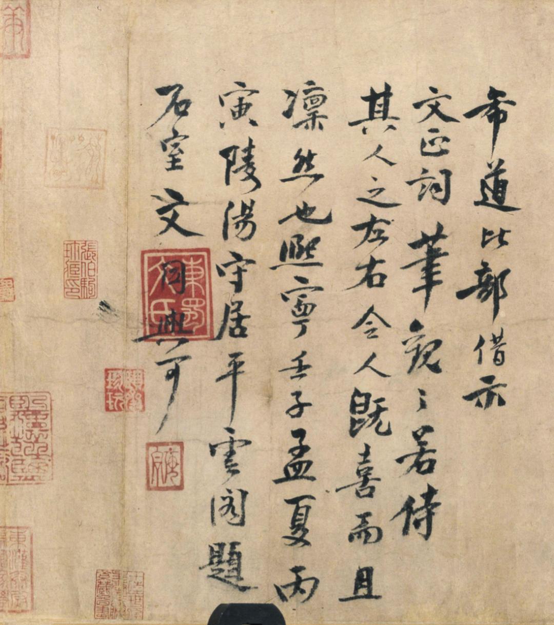 《道服赞》卷题跋,宋,文同,纸本,现藏故宫博物院,此题跋书于范仲淹为友人“平海书记许兄” 所制道服赞文卷后,也是文同留存的唯一书法真迹