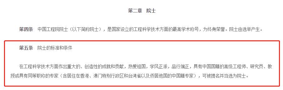 根据2018年修订的《中国工程院章程》第五条,院士的标准和条件是指:“在工程科学技术方面作出重大的、创造性的成就和贡献,热爱祖国,学风正派,品行端正,具有中国国籍的高级工程师、研究员、教授或具有同等职称的专家(含居住在香港、澳门特别行政区和台湾省以及侨居他国的中国籍专家),可被提名并当选为院士。”