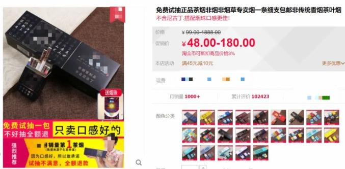 商家一般都会着重介绍,茶烟口感像传统香烟,但不含尼古丁和焦油,没有任何有害物质,价格便宜的一包三五元,贵的要五六十元。
