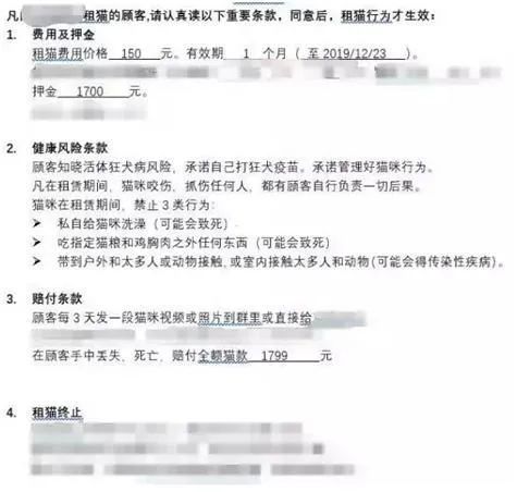 除此之外,店内设有“长租奖励”,租期达6个月后送同款成猫,即如果按周租百元计算,八周之后就能将店内价格为800元的成猫“占为己有”。租期内,如果猫咪发生意外仍需照价赔偿。