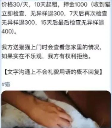 去年年初,有网友在微博分享了一篇咸鱼出租猫的帖子,上面写着:“文字沟通上,不使用礼貌用语的概不回复。”该用户称,申请租售要经过双重面试:先文字、后电话。网友询问详细流程时,对方以未使用礼貌用语为由,拒绝回答问题,并称“沟通是面试的过程”,用以筛选顾客是否拥有租赁资格,“只有通过后才能电话交流。”