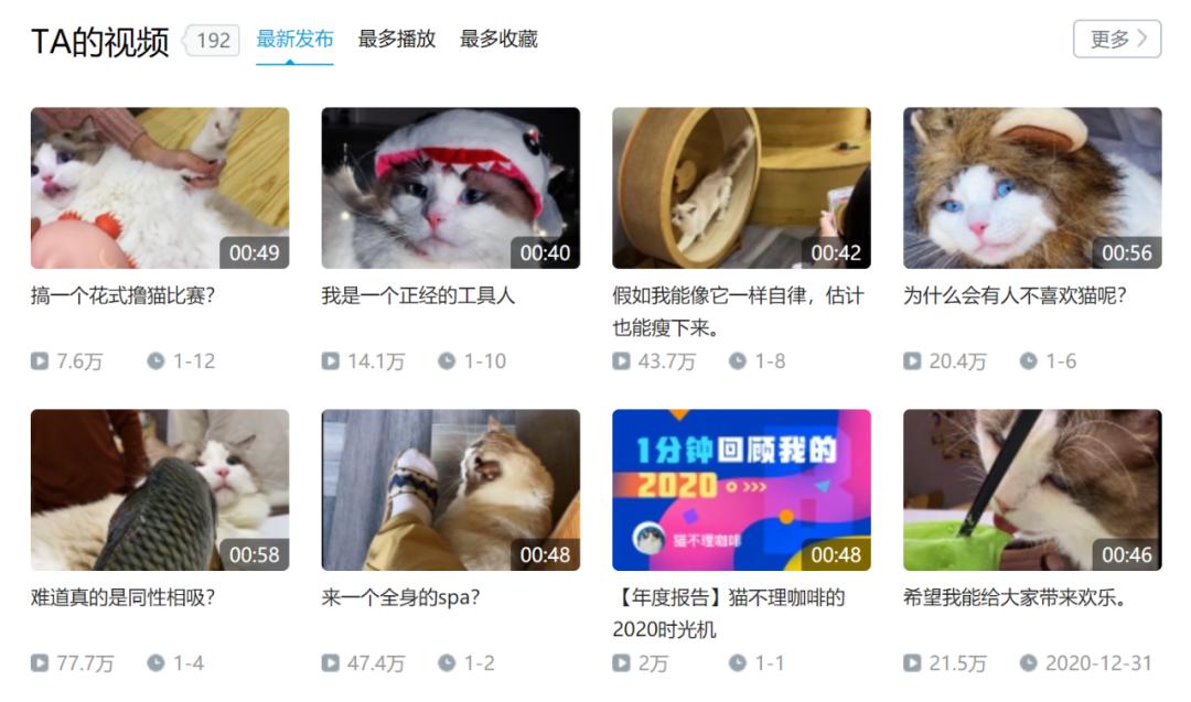 为了维持“猫家生计”,店主必须寻找新的盈利业务。有人通过编纂故事和场景,推出云吸猫的短视频。B站网红up主“猫不理咖啡”坐标山东青岛,拥有一家实体猫咖,在疫情以来的短短7个月内,共发布192条视频,增粉8.1万,播放量超2000万。线上视频的走红大量增长了线下实体店的客户流量,目前消费均价在40元左右,每天有大量穿着打扮时髦的女生在猫咖拍照、打卡。