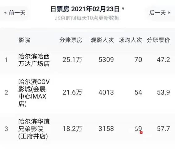 哈尔滨市自 2 月 23 日零时起,符合防控要求的电影院可有序恢复开放,迟来的 " 哈尔滨春节档 " 让电影市场迎来一波 " 报复性消费 ",包揽了当天中国票房最高的 10 家电影院。