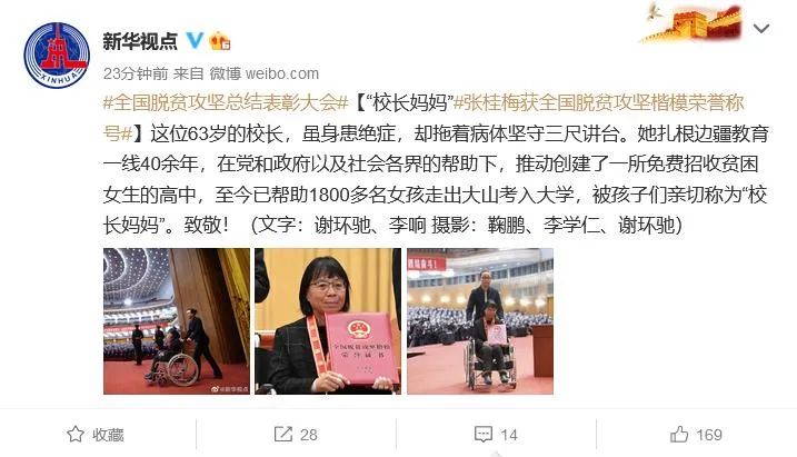 对张桂梅获“全国脱贫攻坚楷模”荣誉称号