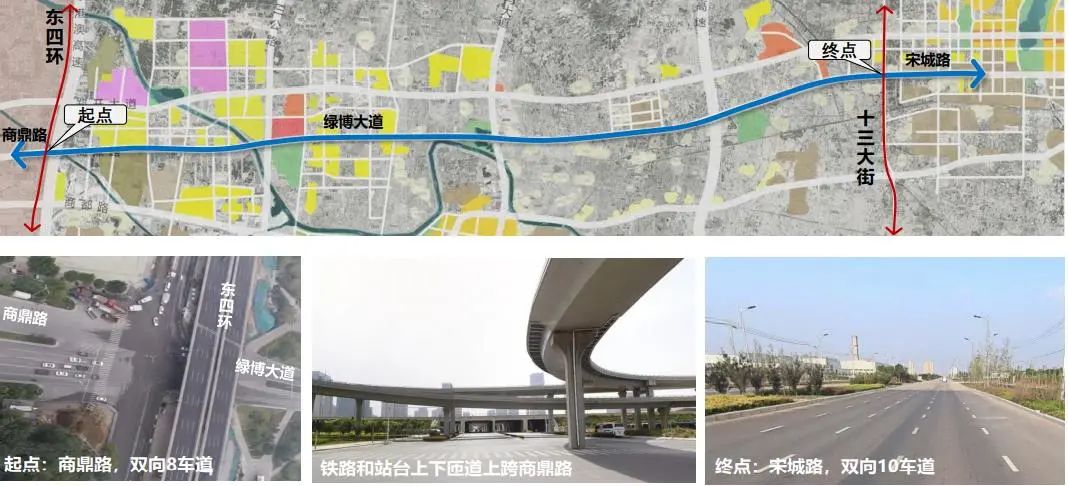 绿博大道西接商鼎路,东连宋城路,东四环至十三大街段全长约37公里。绿博大道的改造方案主要以优化道路断面,公交优先,快慢相间的方式,提升慢行标准、塑造核心景观,打造低碳环保、运动休闲的景观大道。