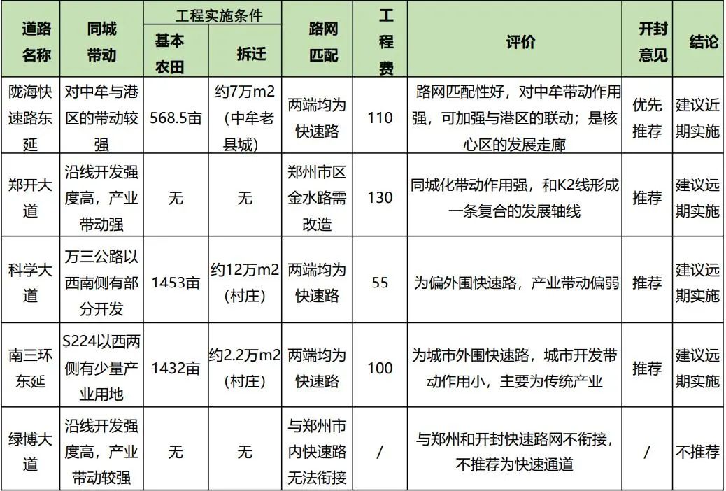 综合5条道路方案,报告中也给出了综合比选分析。其中,陇海快速路东延方案开封意见为“优先推荐”,结论为“建议近期实施”,郑开大道、科学大道、南三环东延开封意见均为“推荐”,结论均为“建议远期实施”,而绿博大道方案因与郑州和开封快速路网不衔接等原因,不推荐为快速通道,结论为“不推荐”实施。