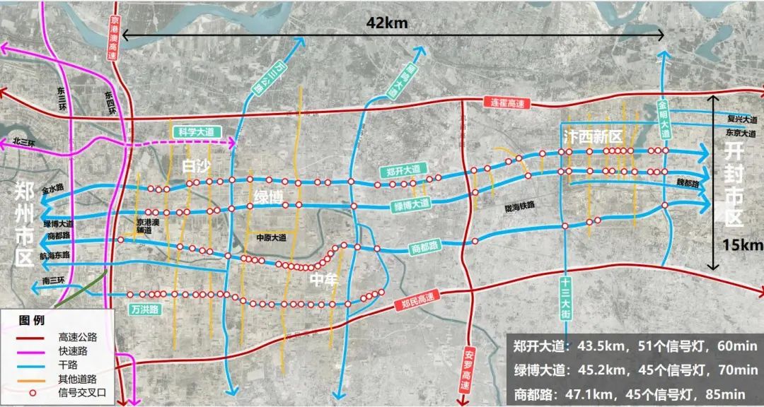 《汇报》中指出,郑州到开封现有三条主干路:郑开大道、绿博大道(郑汴物流通道)和商都路,由于红绿灯密集,快速通行效率较低,运行时间均超过1小时。其中, 郑开大道43.5公里,51个信号灯;绿博大道45.2公里,45个信号灯;商都路47.1公里,45个信号灯。
