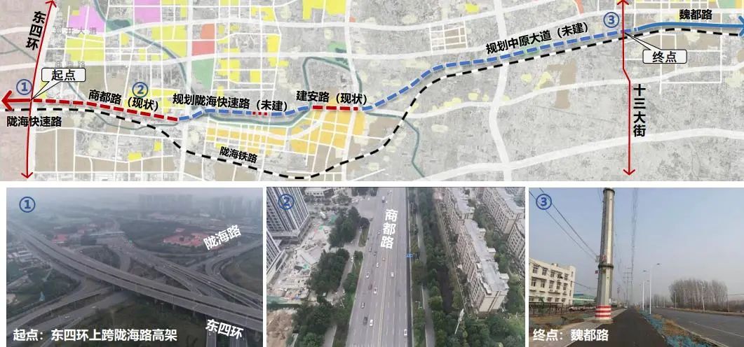 根据汇报方案(下同),陇海快速路东延,西接陇海快速路(东四环节点),东连开封市魏都路,全程约38公里,主要沿既有商都路至中牟县西侧,再沿规划陇海快速路线位从中牟县北侧敷设,之后从老城区的建安路穿过后,新建线位接规划中原大道,至开封接魏都路。项目工程费用110亿元,施工包括桥梁、道路和隧道,工程施工总工期为18个月。路网匹配性好,对中牟带动作用强,可加强与港区的联动,是核心区的发展走廊。