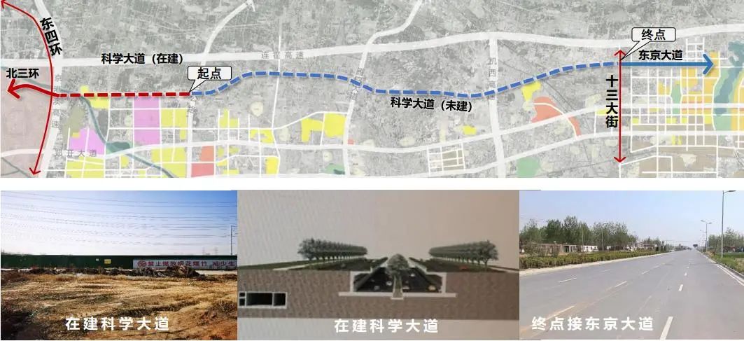 科学大道快速通道位于连霍以南,郑开大道以北,因为科学大道白沙组团段是浅埋式快速行驶,所以方案西起万三公路(规划快速路),东至十三大街 (规划快速路)。西接在建科学大道,东接现状东京大道,全长26.7公里。总体布置方案为采用地面快速路形式,与主要南北向干道采用上跨 形式,与万三公路、广惠街、雁鸣大道、S224及十三大街等快速路设置互通式立交,与安罗高速相交处设置收费站。