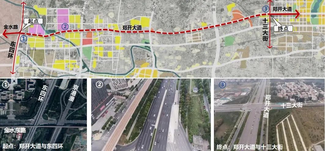 郑开大道西接郑州市金水东路,东连开封境内郑开大道,东四环至十三大街段全长约36公里。项目工程费用130亿,工程施工总工期18个月。郑开大道目前道路两侧的城市界面已经初具雏形,是目前郑州开封双城之间的主要通行要道。全线建设条件较好,无新增征地和拆迁。由于郑开大道位于城市中心,且与主要纵向道路相交,是郑开同城化区域的重要横向路网骨架。