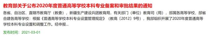 3月1日,教育部官网公布《2020年度普通高等学校本科专业备案和审批结果的通知》。