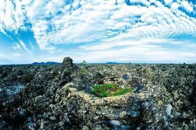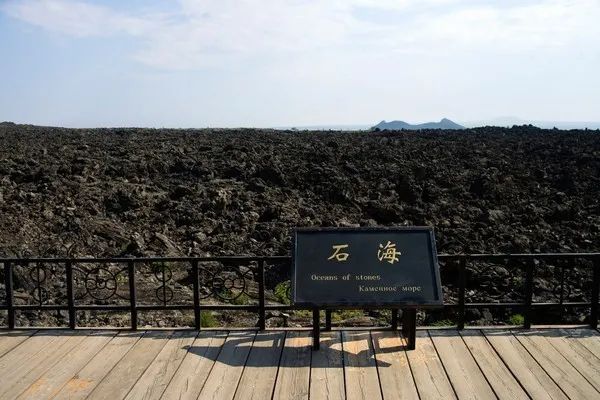 火山口北侧有个缺口,为火山熔岩溢出的通道。裸露地表的大面积熔岩"石流",就是从这个缺口溢流而下,形成了浪峰叠出、气势磅礴的熔岩波浪,一波接一波地跌宕起伏,远望像一片汪洋,近看石涛汹涌,很是壮观。