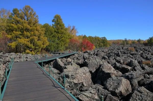站在火山口能够远眺五大连池全貌,火山锥排列有序,紧紧相依,毗邻的湖泊错落有致,湖面波光粼粼,有如珍珠般地镶嵌在火山周围,景色秀丽宜人。下山沿栈道可以参观石海景区,呈带状分布向南流的熔岩,延伸达17公里之远,形如巨大的长龙,被称为"石龙",这也是老黑山的一大奇观。
