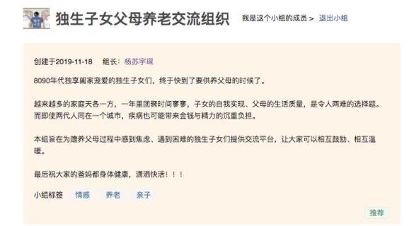小组组长是一个叫吕萨拉的豆友。吕萨拉的爷爷患阿兹海默症,外公中风,都需要长期看护,父亲有三兄弟,母亲有两兄妹,也只能勉强照顾。吕萨拉开始担心,“作为独生子女的我,以后能负担父母的养老吗?尤其是在离家工作的情况下。”2019年11月,她创建了这个小组,为赡养父母感到焦虑、遇到困难的独生子女提供交流平台,相互鼓励、取暖。
