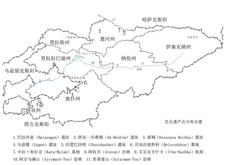此次考察城址 5 处、墓地 2 处、岩画及铭刻 4 处,分布在吉尔吉斯斯坦境内北部和西南部,此次调查增进了我们对吉尔吉斯境内的遗产点分布及文化内涵的了解。