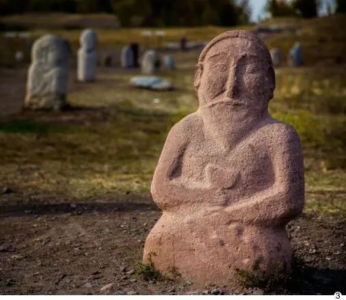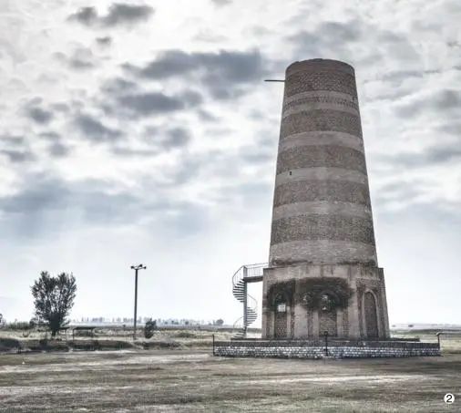 巴拉沙衮 巴拉沙衮遗址即布拉纳遗址,位于楚河州。遗址区域东侧保存有伊斯兰教宣礼塔,现高 24 米,宣礼塔西北处见城堡、城墙等遗迹。据吉方学者介绍,巴拉沙衮城始建于 10世纪喀喇汗王朝时期。遗址区北侧有大量突厥石人,年代为 6—10 世纪,它们并非出土于巴拉沙衮城内,而是在楚河流域收集之后放置于此。从造型上看,石人以男性居多,或站或坐,留有胡须,双手置于腹部,右手放于左手之上,握有高柄酒杯。这些石人多数高 1.3 米左右,用天然石料雕刻而成。