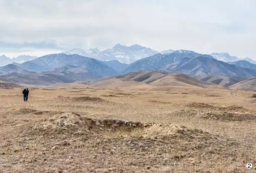 其次,两处墓地规模较大,墓葬数量多,分属南北不同区域。北部贝洛沃德斯科墓地根据残存在地面的封土,目前可见的墓葬数量超过 20 座,以 3 座或 5 座为一组呈直线排列。地面残存封土较大规模的直径超过 30 米,较小的也有近 20 米,残高一般在 10 米左右。墓地整体保存状况较好,封土和墓葬形制完整,由于未见发掘资料,其埋葬方式、葬具葬式、随葬器物等信息尚不明确。卡拉·布拉克墓地的分布未见其规律性,封土为土堆混杂碎石或直接用较大圆石填埋,封土中间塌陷,所用葬具为木棺。通过对比,南部的卡拉·布拉克墓葬形制较小,封土采用圆石或碎石,北部贝洛沃德斯科墓葬形制较大,封土为圆形土丘。墓葬形制特征的差别,直接表现了吉尔吉斯南、北区域的文化差异,同时也展示了中亚地区文明的多样性。