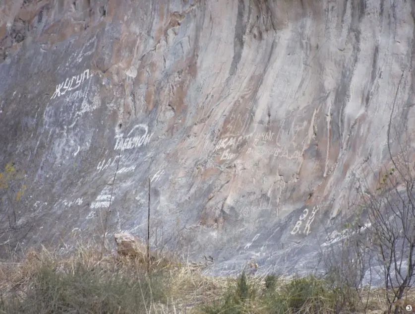 艾尔克卡什卡铭刻 艾尔克卡什卡铭刻位于艾尔克卡什卡村南部约 2 公里处的山谷中,距离奥什西南约 26 公里。铭刻在山谷西侧的岩壁上,山谷中有一条河,水流湍急,没有桥梁,因此只能从远处观察。铭文约有 4 处,字母较大。从地形来看,周围的山谷中只有这里有河流,沟通了不同的地区,这可能是这一处铭刻选址的重要原因。除了粟特文的铭刻,似乎还有阿拉伯文和现代俄文的铭刻,以及大宛天马、动物的岩画。整体的保护现状不容乐观。