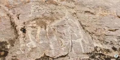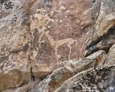 再次,本次考查的 4 处岩画、铭刻主要集中在奥什地区,这里地处费尔干纳盆地东侧,自古就是东西文化交流的通道,是游牧民族与农耕社会交融的枢纽。岩画内容以大宛天马为主,还有少量其他动物形象,同时也见日、月、人物狩猎场景等画面。画面基本采用正投影画法,多发现于山顶岩石上,或许是因为动物经常出没此处,或许这里是放牧的必经之地。岩画表达的含义不仅仅是动物本身,也有着人类对大自然的敬畏、崇拜、祈求等寓意,考察后可知,这些岩画附近都存在祭祀遗址或宗教性