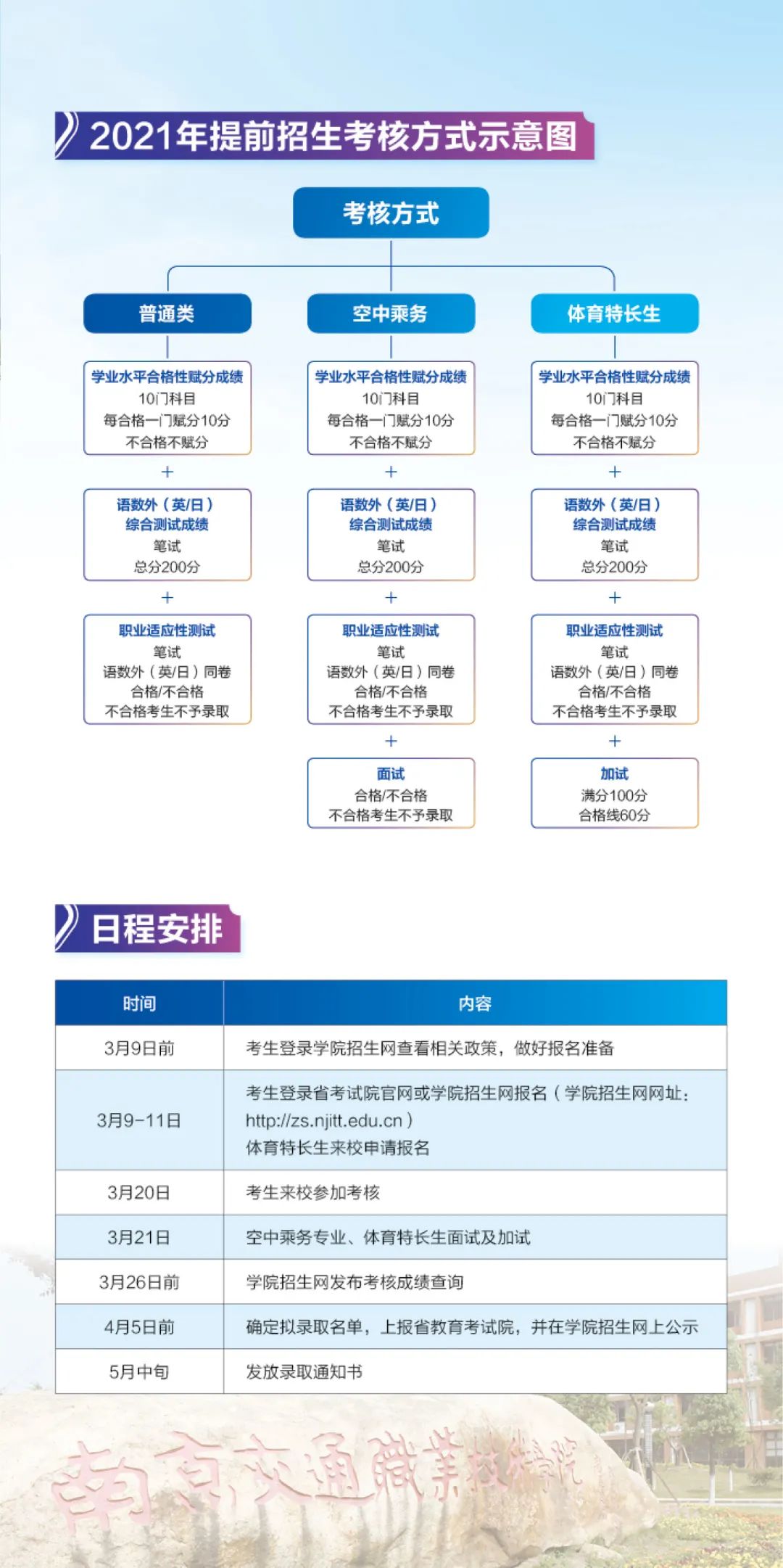 考核方式是笔试。笔试内容包括语文、数学、外语(英语/日语)以及职业适应性测试,几门科目同一张卷子考核。除了空中乘务专业有面试,体育特长生有加试,其他考生参加笔试即可。录取规则:录取总分由10门合格性考试赋分(满100)+学院校考分(满200)组成,职业适应性测试结果为合格/不合格。职业适应性测试合格考生按总分(满300)由高到低依次录取。