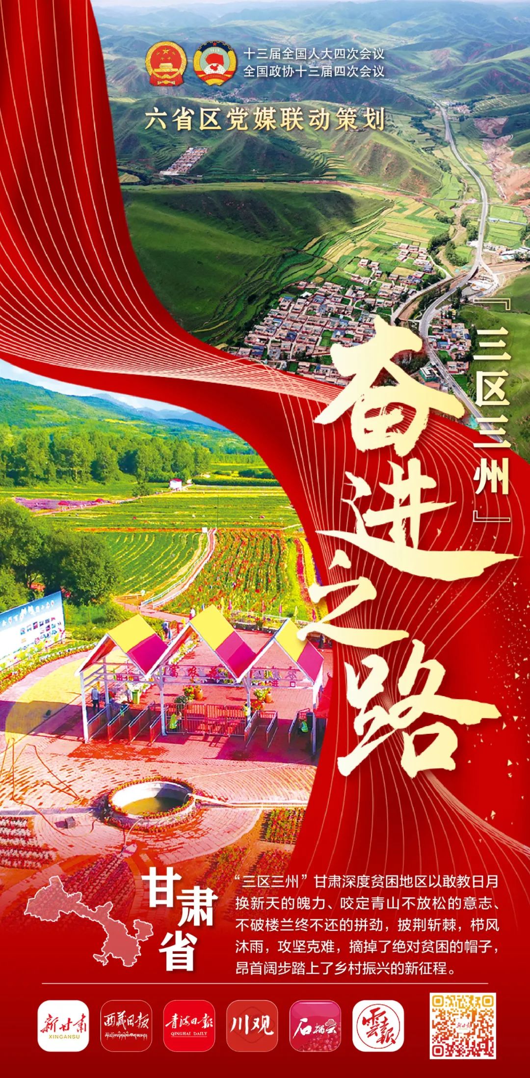 为呈现“三区三州”决战决胜脱贫攻坚道路上的历史巨变,在今年全国两会召开之际,甘肃日报社、甘肃日报报业集团、甘肃新媒体集团新甘肃客户端联合新疆、西藏、青海、四川、云南“三区三州”党媒党端推出联动策划,以“奋进之路”为主题,综合运用海报、短视频、H5等形式,通过“三区三州”脱贫路上的奋斗缩影折射脱贫攻坚带来的巨大变化,全景式展现各族群众脱贫致富奔小康的激情与梦想。