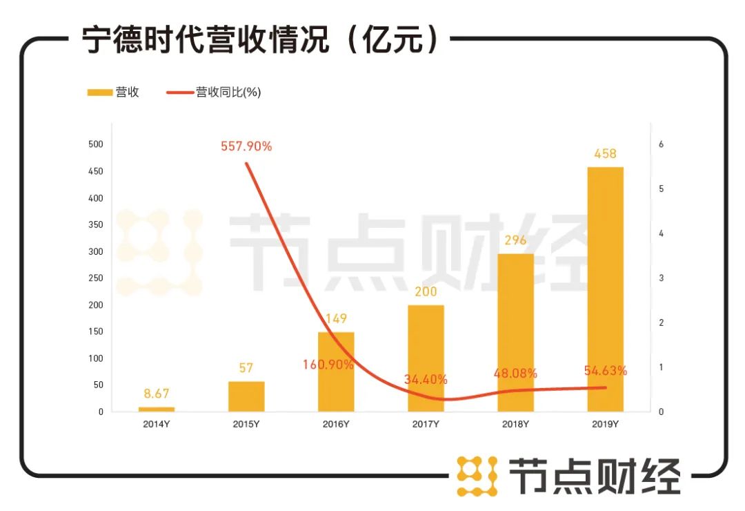 2018年6月,宁德时代成功登陆创业板,市值很快超过中国最大车企上汽集团。到2019年,宁德时代营收同比增长54.63%至458亿元,市场份额在当年三季度创下63.58%新高,成了行业“寡头”。