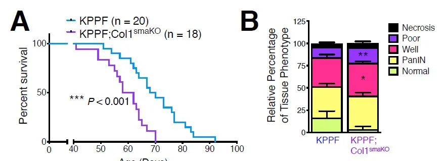 在胰腺导管腺癌(PDAC)中,Col1是肿瘤间质/微环境的主要组成部分,与PDAC相关的α-平滑肌肌动蛋白阳性(Alpha-smooth muscle actin, α-SMA+)肌成纤维细胞(激活的胰腺卫星细胞)被推测对Col1的产生有重要贡献,并被认为可以阻碍药物向癌细胞的传递、限制T细胞的浸润;此外,近来研究表明,PDAC中的间质成纤维细胞可能在不同条件下发挥不同功能,促进或抑制肿瘤发展。然而,Col1在PDAC的发生和发展中的确切功能尚不明确。