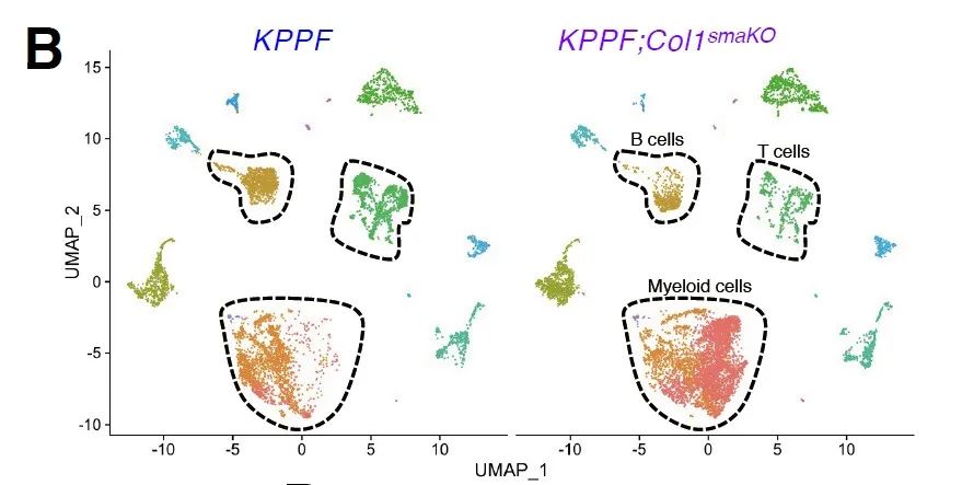 为了探索αSMA+肌成纤维细胞中Col1缺失影响PDAC进展的机制,研究从基质细胞组成、肿瘤细胞表型、免疫细胞亚群等角度进行了分析。KPPF;Col1smaKO小鼠和KPPF小鼠的肿瘤单细胞转录组测序结果表明,成纤维细胞、内皮细胞、粒细胞和癌细胞等几种细胞群的细胞数量和亚群分布基本相似,且癌细胞的亚群分布和表达特征也相似。有趣的是,KPPF;Col1smaKO小鼠肿瘤中髓系细胞、T细胞和B细胞的特征明显改变,髓系细胞根据基因表达聚类成两个不同的亚群(Myeloid-1和Myeloid-2),且Myeloid-2亚群与肿瘤相关的巨噬细胞和相关的髓系来源的抑制细胞(MDSCs)具有共同的分子特征(CD206+ F4/80+ Arg1+),KPPF;Col1smaKO肿瘤表现为Myeloid-2亚群增多,T、B淋巴细胞减少,髓系细胞/T细胞比例增加。免疫组化染色和流式细胞术进一步证实了这一结果。