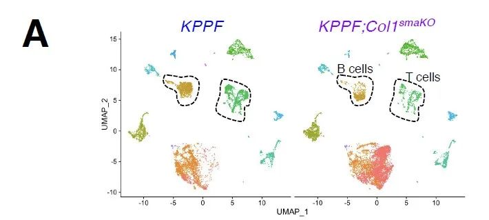 研究首先验证了双重组酶系统小鼠模型发生自发性胰腺癌,并存在进行基质细胞特异性基因操作的可能性。研究使用Flp-FRT系统、Cre-loxP系统分别诱导了两个Kras表达且p53丢失的小鼠家系(KPPF小鼠和KPPC小鼠),将两个家系结合,并利用双同源重组报告系统,研究者用EGFP和tdTomato分别标记了Pdx1谱系的癌细胞和α-SMA阳性的肌成纤维细胞,并观察到随着疾病进展,Col1在胰腺组织中的沉积量逐渐增加。此外,作者对KPPF小鼠胰腺肿瘤的活细胞混合物进行了单细胞转录组分析,再次验证了成纤维细胞是KPPF小鼠Col1的主要贡献者。