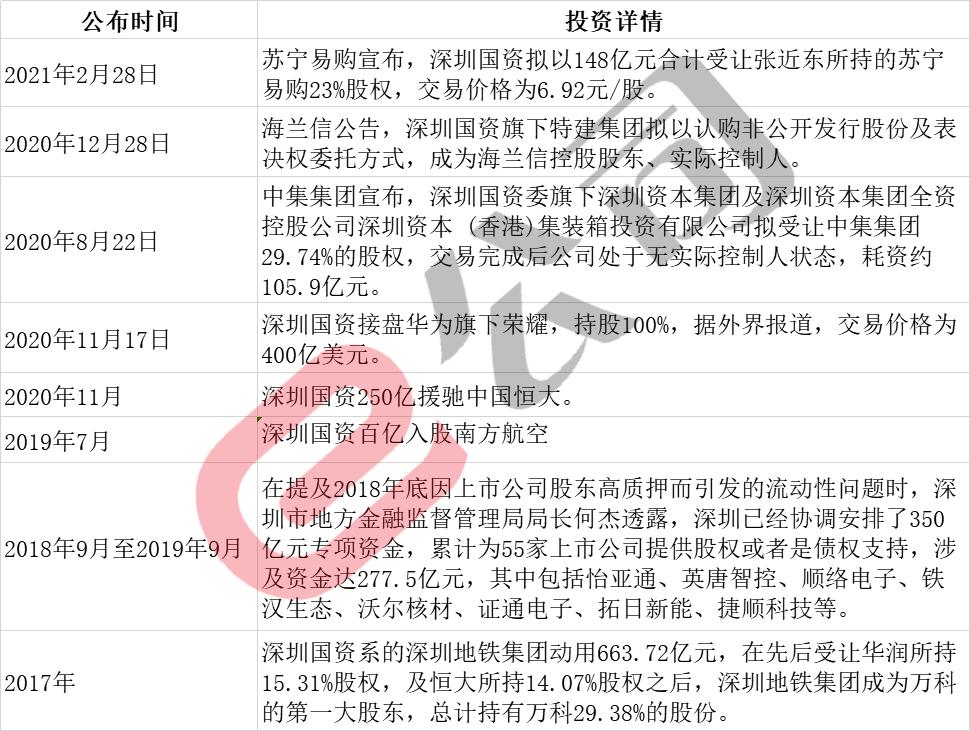 从2017年“宝万之争”时深圳地铁拿下万科A 29.38%股权,到2018年至2019年深圳国资专项纾解上市公司流动性,再到2020年深圳国资先后宣布拟入主中集集团、海兰信与公开收购华为旗下荣耀,以及近日刚刚宣布的拟以148亿入股苏宁易购……近年来,深圳国资动作频频。