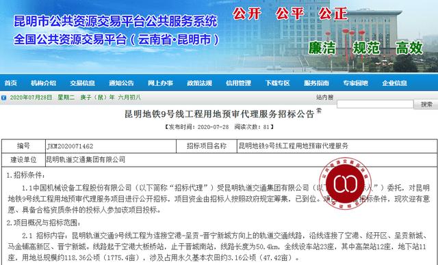 2020年7月,昆明轨道交通集团有限公司发布昆明地铁9号线工程用地预审代理服务招标公告,更新了地铁9号线的进展信息。