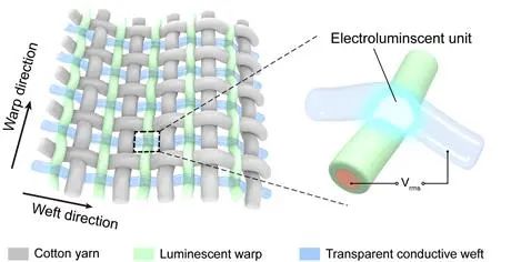 团队在导电纤维纬线的力学性能方面下足了功夫,通过熔融挤出方法制备了一种高弹性的透明高分子导电纤维。在编织过程中,该纤维由于线张力的作用,与发光纤维接触的区域发生弹性形变,并被织物交织的互锁结构所固定。“通过对高分子导电纤维的模量调控,使其在与发光经线交织时发生自适应弹性形变,从而形成稳定接触界面,并使得在纤维曲面上形成了类似平面的电场分布,从而确保了织物中‘像素点’的均匀稳定发光。”彭慧胜说。