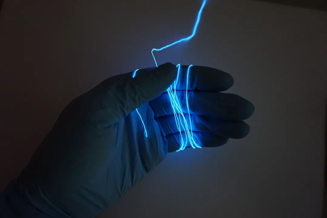 比起传统的平板发光器件,发光纤维直径可在0.2 毫米至0.5 毫米之间精确调控,奠定了其“超细超柔”的特性。以此编织而成的衣物,可紧贴人体不规则轮廓,像普通织物一样轻薄透气,确保良好的穿着舒适度。
