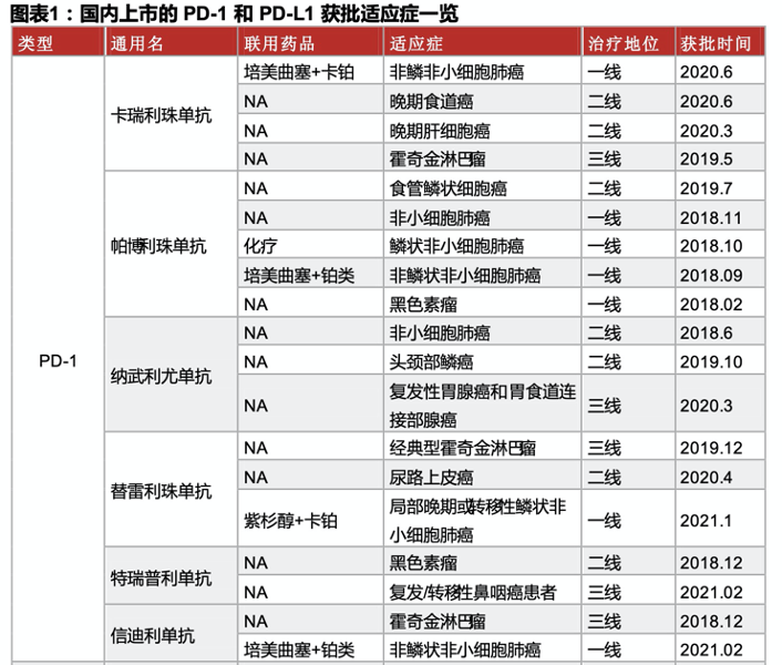 2018年底,君实生物的特瑞普利单抗在国内获批上市,主要用于黑色素瘤的治疗;一个月之后,信达生物的信迪利单抗问世,主要针对经典型霍奇金淋巴瘤的治疗。2019年,恒瑞医药的卡瑞利珠单抗、百济神州的替雷利珠单抗相继上市,当时获批的适应症均为经典型霍奇金淋巴瘤。