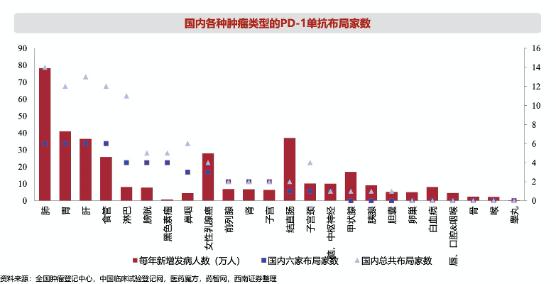 此外,联合用药将成为PD-1临床应用的主流场景。相比于单药,PD-1与化疗药物、靶向药物、免疫药物的联用疗效更优,西南证券团队预计,未来联合用药的获批将逐渐增加,PD-1可能成为“打底”药物与各种机制的抗肿瘤药联用。
