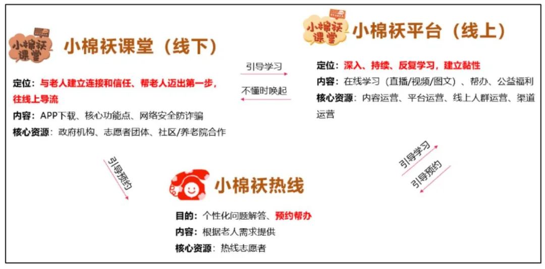 之后,项目组又把手册中的内容升级成线下+线上课堂。通过线下课堂,带老人掌握入门级的手机操作知识;线上课堂中的视频、图文教程,可以帮助老人忘了的时候来复习。此外,该项目还开通了老年人专属的热线一对一服务,包含预约形式和老年人一键呼叫绿色通道。预约形式下子女或老人的亲属友人都可以帮老人预约热线,而老年人一键呼叫绿色通道仅对老年人开放。