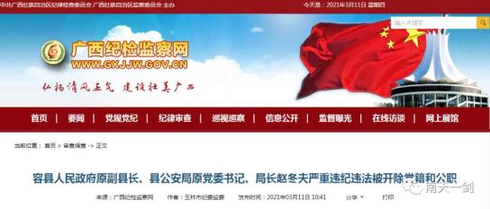 容县人民政府原副县长、县公安局原党委书记、局长赵冬夫严重违纪违法被开除党籍和公职