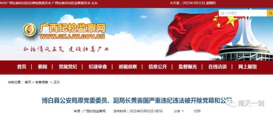 博白县公安局原党委委员、副局长黄善国严重违纪违法被开除党籍和公职