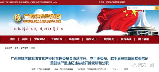 广西黄姚古镇旅游文化产业区管理委员会原副主任、党工委委员、昭平县黄姚镇原党委书记黄健雄严重违纪违法被开除党籍和公职