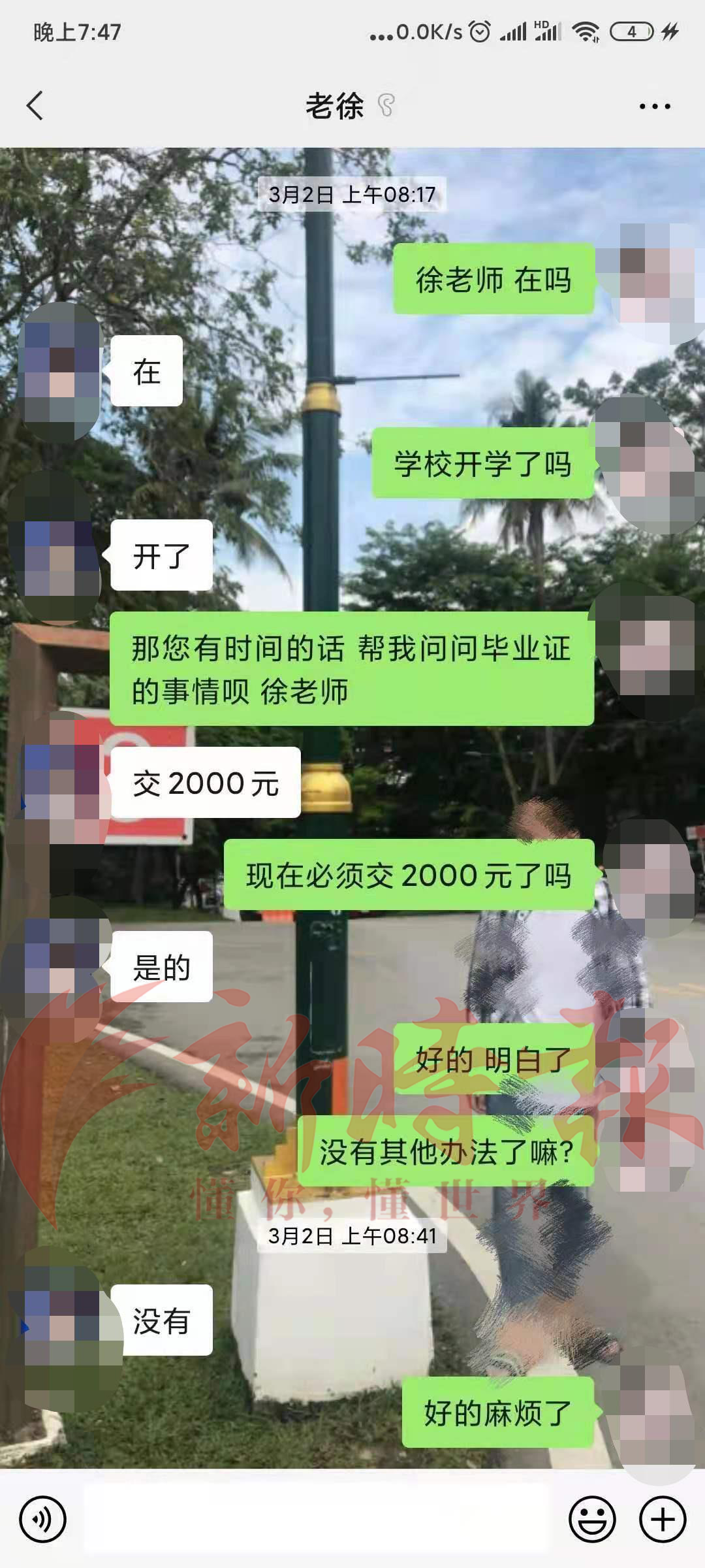 今年3月,事情又有了新的变化。这一次,小马从徐老师那里得知,按照学校的规定,要想拿到毕业证书,必须得先交2000元。“徐老师说这是补交的学费,可是开学的时候我们都一次性交清学费了,这笔钱出处又在哪儿呢?”小马说,现在他和很多都没拿到毕业证的同学,均被要求先补交上这2000元才行。