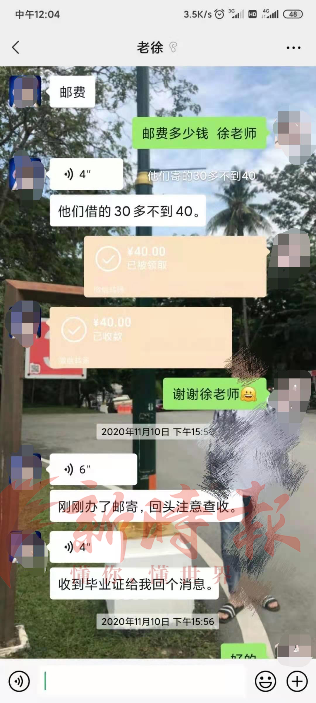 由于没能拿到毕业证书,过去两年里,小马找工作也一直不顺利,目前回到老家聊城在一家设计公司上班。这期间,小马曾多次向学校打听过毕业证的情况,但没有得到回应。“去年11月,我们的班主任徐老师突然给我说,可以把毕业证邮寄给我了,我给他转了40元邮费。过了两天,徐老师给我回复说‘刚刚办了邮寄,回头注意查收,收到毕业证给我个消息’。”然而,令小马感到意外的是,小马之后很多天一直都没收到毕业证,之后再联系徐老师,也没得到回复。