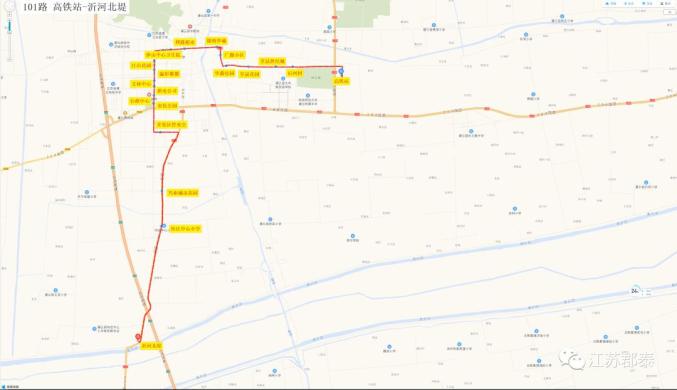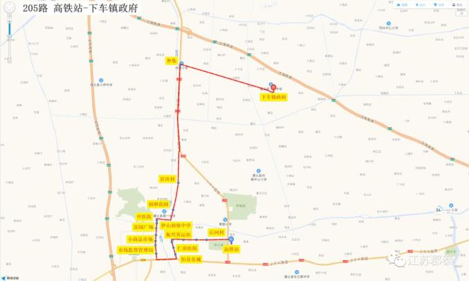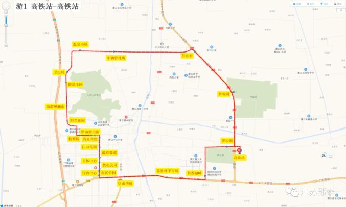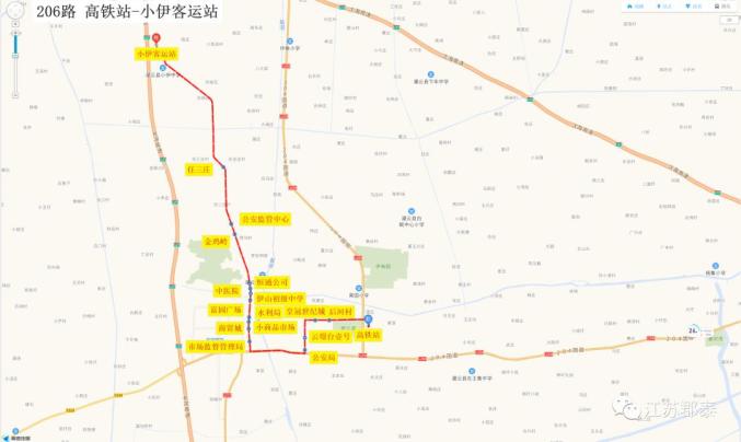 站点:高铁站-后河村-皇冠世纪城-皇冠花园-华鑫佳园-振兴客运站-仁济医院-怡景花城-市场监督局–苏果超市-水利局-商贸城-利群超市-新村小学-伊山中心卫生院-清泉宾馆-伊山派出所-检察院-事故处理中心–城西分校-西城国际-伊山镇政府-交通运输局-自来水厂-许相村-中学生实践基地-陡沟中心小学-陡沟中学-龙苴镇政府-穆圩