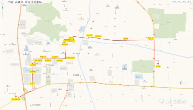 站点:高铁站-果园小学-桃垛村-君悦华庭–城东供电公司-第一中学-中医院-公共卫生服务中心-防疫中心-新村农贸市场-供电小区北门-溢彩馨都北门-馨福家园北门-恒驰大厦-和盛怡景苑北门-人民医院-美都新城西门-嘉天下东门-淮连批发市场