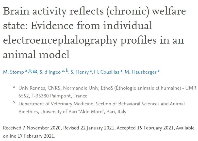 此外,考虑到主观个体认知和情感加工,对动物福利进行评估成为了一项挑战。脑电图(EEG)频谱分析已经证明了一种可用于评估人类脑部活动和情感或认知状态之间联系的生态学上有效的记录情况:较高的慢波 / 快波比值与积极的内部状态息息相关。特别地,theta 功率的高产生(3-8Hz)与积极情绪有关。另一方面,有假设认为,大脑左半球(LH)占据主导地位可能会带来更好的福利状态。