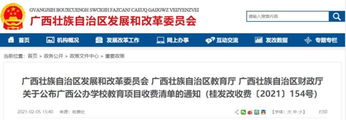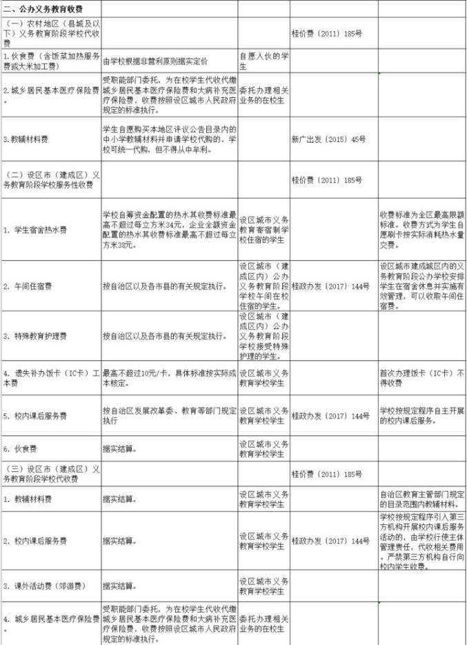 近日,自治区发展改革委、自治区教育厅、自治区财政厅印发了《关于公布广西公办学校教育项目收费清单的通知》(以下简称《通知》),公布了广西公办学校教育项目收费清单,并提出要对各级各类公办学校收费项目进行清单管理,各中小学校(幼儿园)除教育项目收费清单外,未经国家或自治区批准,不得再向学生收取其他任何费用,严禁学校或其他机构以任何名义在学校内代收其他任何费用。