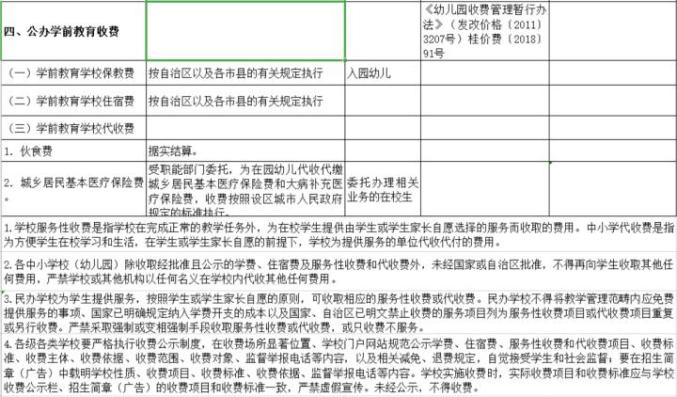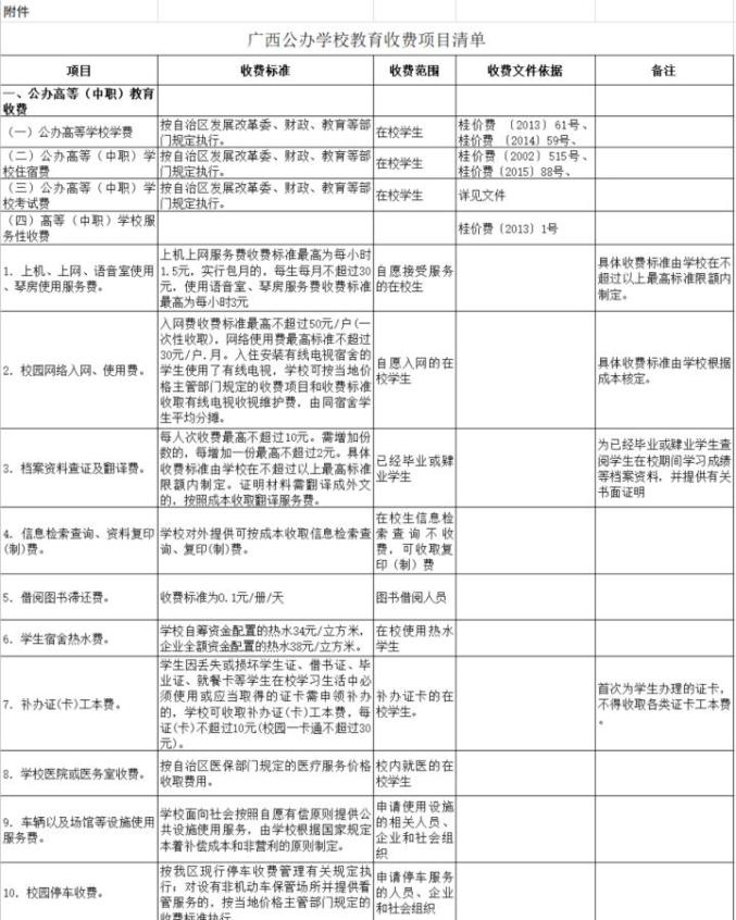 广西公办学校教育项目收费清单明确了公办高等(中职)教育收费、公办义务教育收费、公办高中教育收费、公办学前教育收费等四类的收费标准、收费范围、收费文件依据。