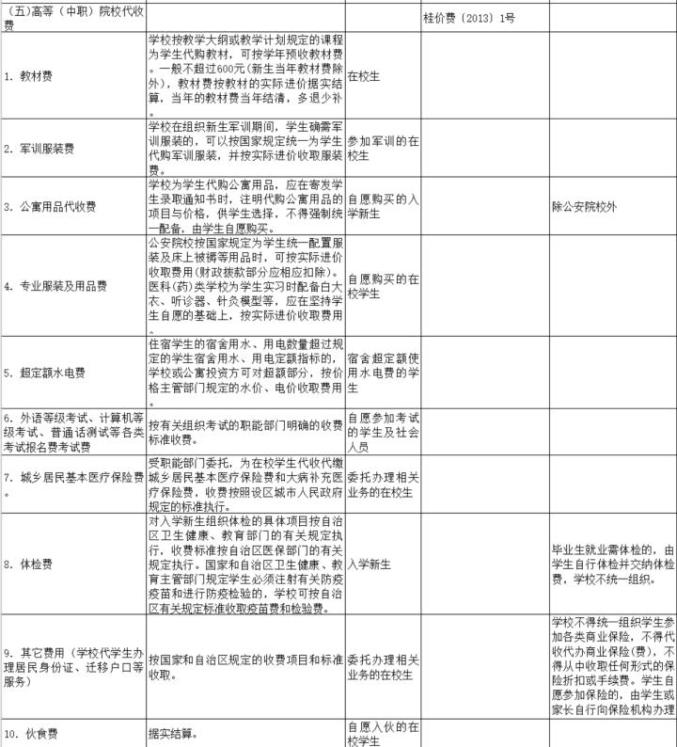 公办高等(中职)教育收费包括学费、住宿费、考试费、服务性收费、代收费。其中,服务性收费包括上机、上网、语音室使用、琴房使用服务费;校园网络入网、使用费;档案资料查证及翻译费;信息检索查询、资料复印(制)费;借阅图书滞还费;学生宿舍热水费;补办证(卡)工本费;学校医院或医务室收费;车辆以及场馆等设施使用服务费;校园停车收费;培训费。代收费则有教材费,军训服装费,公寓用品代收费,专业服装及用品费,超定额水电费,外语等级考试、计算机等级考试、普通话测试等各类考试报名费考试费,城乡居民基本医疗保险费,体检费以及其它费用(学校代学生办理居民身份证、迁移户口等服务)。
