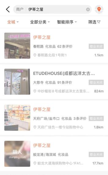 记者在大众点评APP上搜索伊蒂之屋,可以看到成都相关门店均显示“歇业关闭”。